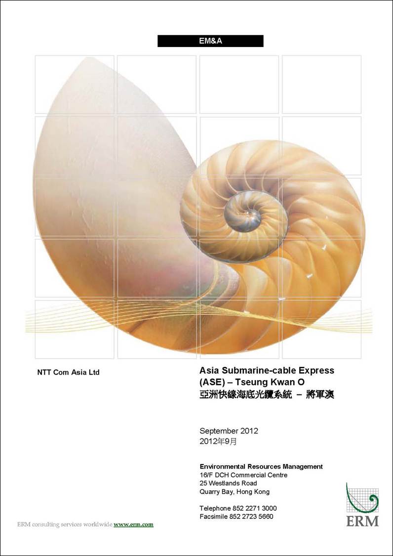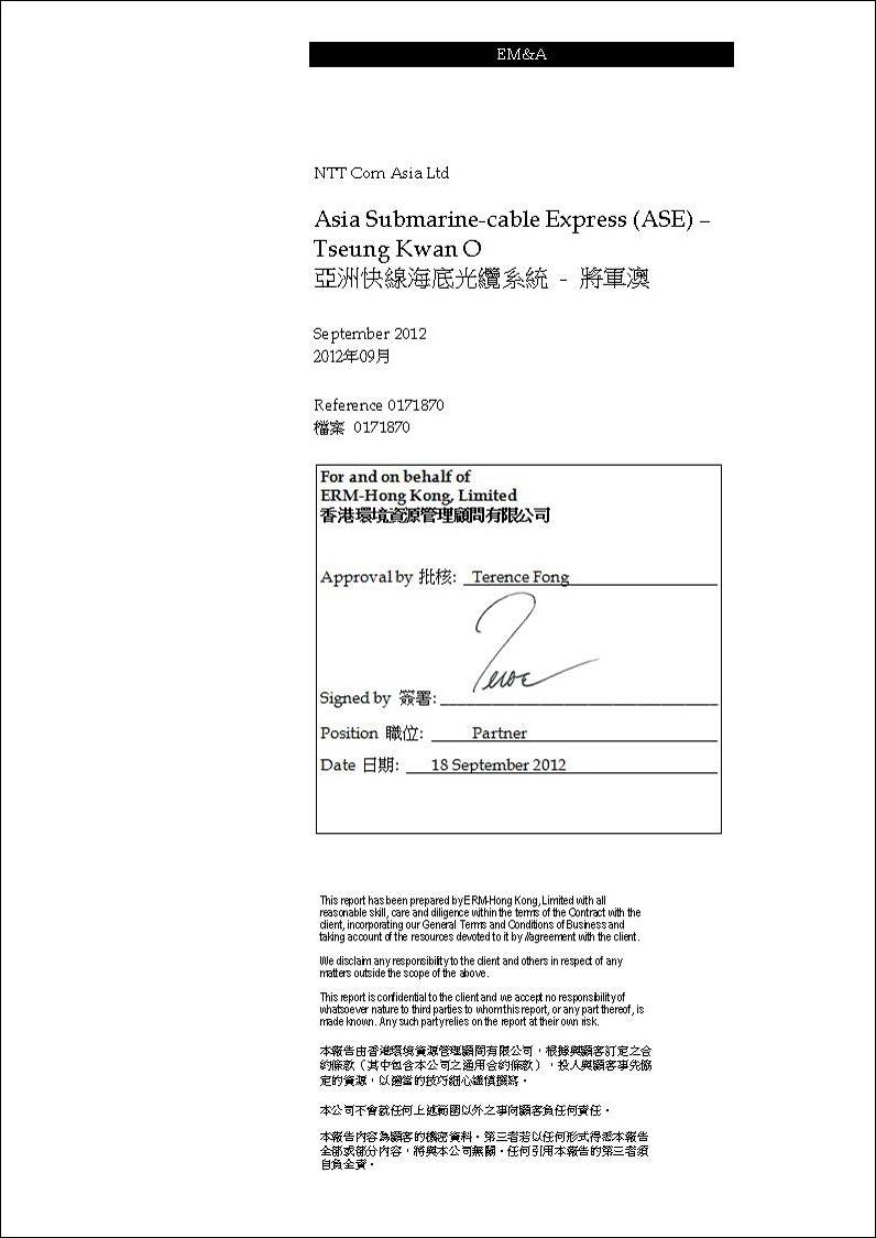 ERM-Hong Kong, Limited (ERM) has been appointed by NTTCA to undertake the environmental permitting and prepare the Environmental Monitoring and Audit (EM&A) Manual (¡§the Manual¡¨) for this Project.  This Manual is a supplementary document of the project entitled Asia Submarine-cable Express (ASE) ¡V Tseung Kwan O (Application No.: DIR-217/2011) and is required to be submitted to the Director of Environmental Protection for approval prior to the application for an environmental permit as listed under the Conditions Imposed under Section 5(12) of the EIA Ordinance for Permission to Apply Directly for Environmental Permit.