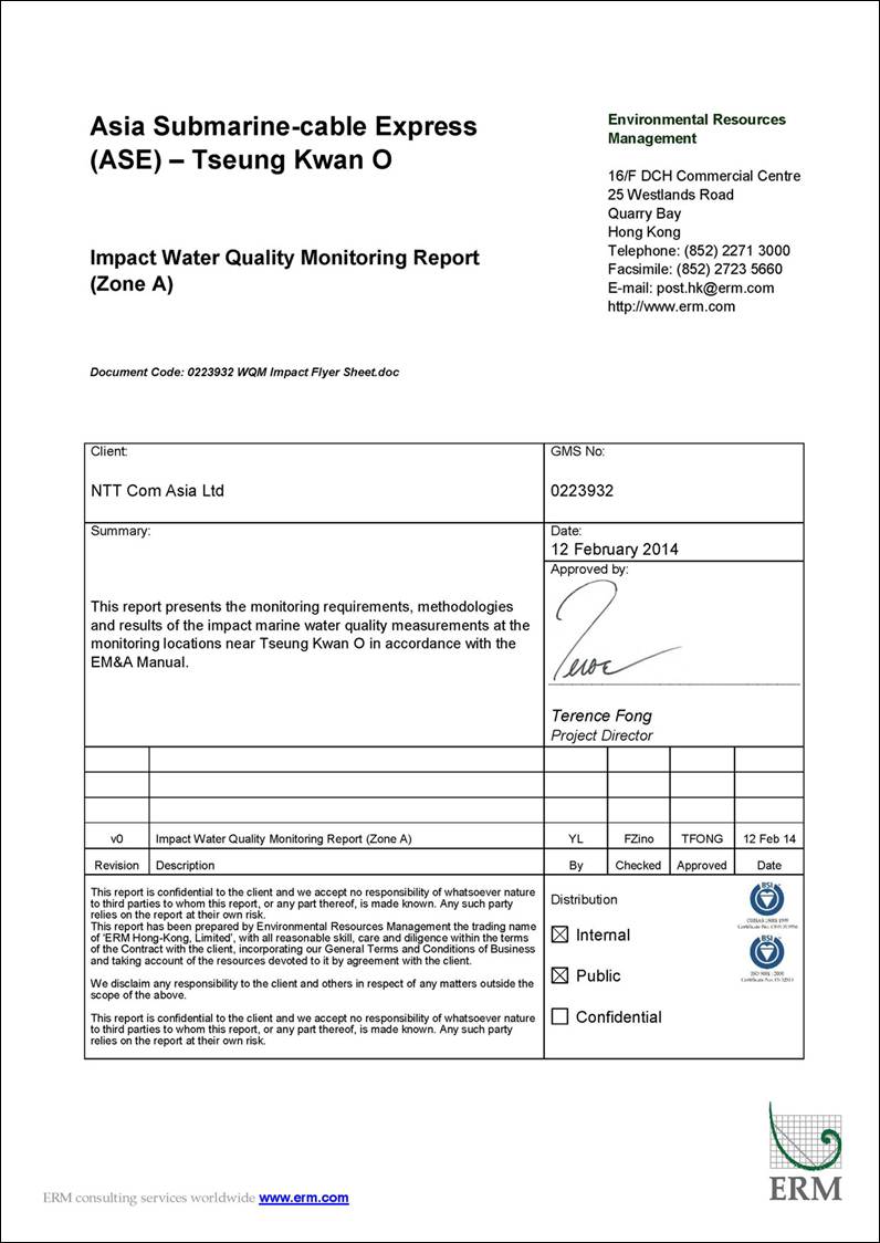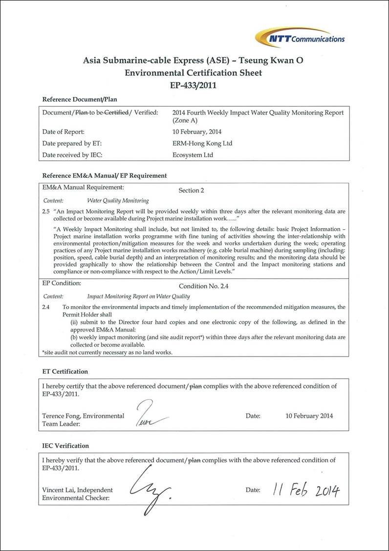 the Asia Submarine-cable Express (ASE) cable system commenced on 12 January 2014. This is the 2014 Fourth Weekly Impact Water Quality Monitoring Report presenting results and findings of the impact water