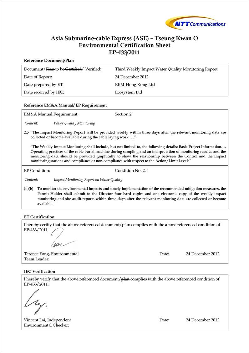 The submarine cable installation works for the Asia Submarine-cable Express (ASE) cable system were commenced on 8 October 2012.  This is the Third Weekly Impact Water Quality Monitoring Report presenting the impact water quality monitoring conducted during the period from 10 December 2012 to 16 December 2012 in accordance with the Monitoring and Audit Manual (EM&A Manual).