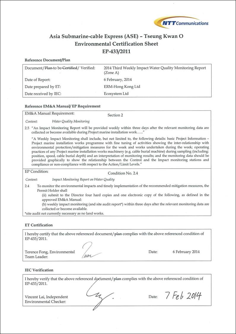 Kong, Limited (ERM) was appointed by NTT Com Asia (NTTCA) as the Environmental Team (ET) to