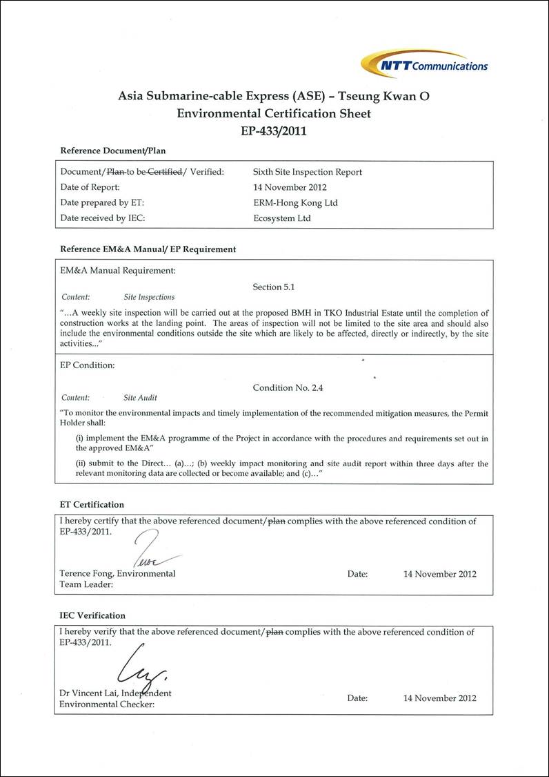 ERM-Hong Kong, Limited (ERM) was appointed by NTT Com Asia (NTTCA) as the Environmental Team to conduct regular site inspections and audit the implementation of all environmental monitoring and mitigation measures recommended in the Project Profile (PP) (Register No. PP ¡V 452/2011) for the Proposed Asia Submarine-cable Express (ASE) ¡V Tseung Kwan O (the Project).