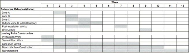 The construction works of the landing point commenced on 4 October 2012 and are temporarily scheduled to be completed in early December of 2012.  After the reinstatement of seawall armour rock, which was finished in last reporting period, the beach manhole construction works were on hold and only the land duct laying was carried out in this reporting week.