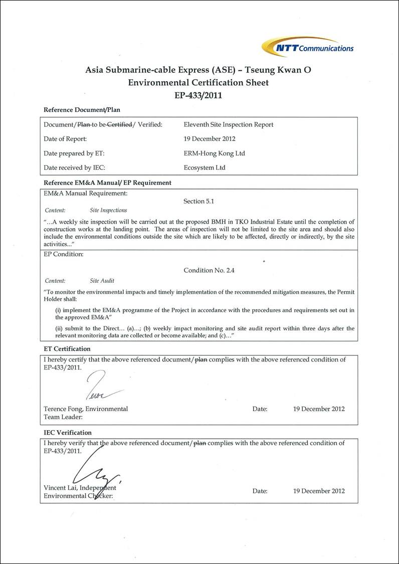 (ERM) was appointed by NTT Com Asia (NTTCA) as the Environmental Team to conduct