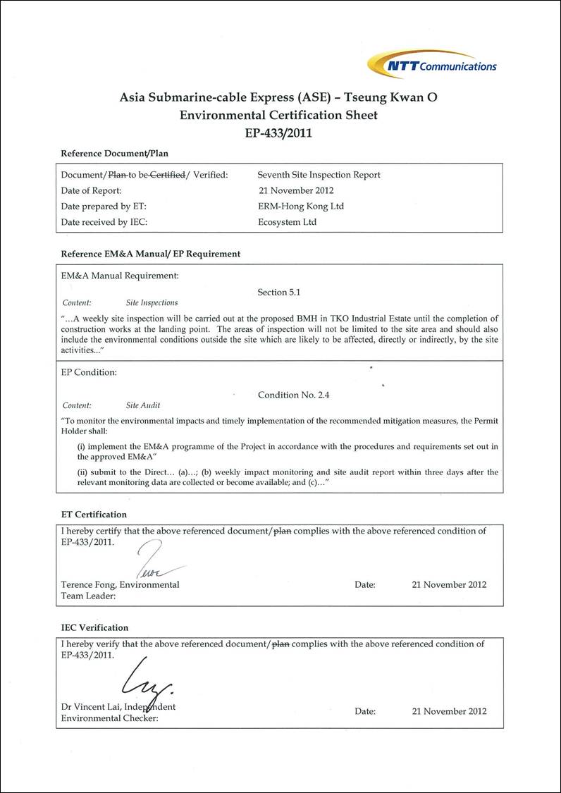 (ERM) was appointed by NTT Com Asia (NTTCA) as the Environmental Team to conduct