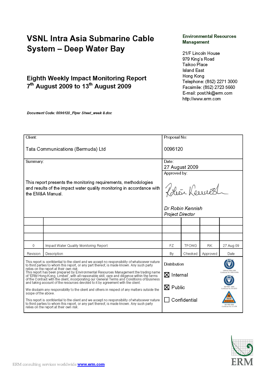 ERM-Hong Kong, Limited (ERM) was appointed by Tata Communications (Bermuda) Ltd (formerly Videsh Sanchar Nigam Limited (VSNL)) as the Monitoring Team (MT) to implement the Environmental Monitoring and Audit (EM&A) programme for the VSNL Intra Asia Submarine Cable System ¡V Deep Water Bay (thereinafter called the (¡¥Project¡¦)).