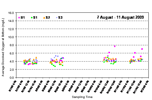 Also, for DO, critical conditions usually occur within the bottom waters during the summer months when the water column is stratified, with a warmer surface layer separated from deeper water by a picnocline, or density gradient.  When the density gradient within the picnocline is high, transport of oxygen from the aerated surface waters to the lower waters by mixing is significantly reduced.  Dissolved oxygen levels could also decrease in the bottom layer because photosynthesis and contact with the air may be significantly reduced.  This phenomenon is supported for the reporting week by the fact that in general DOB concentrations were lower than DO concentrations measured at the surface and mid-depth from 7 August to 11 August 2009.